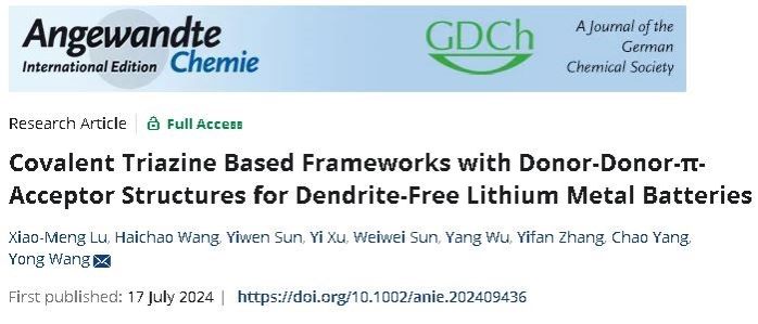 近日,环化学院博士研究生路晓萌连续在国际知名期刊《Angewandte Chemie International Edition》上发表了题目分别为“sp-Carbon-Conjugated Organic Polymer as Multifunctional Interfacial Layers for Ultra-Long Dendrite-Free Lithium Metal Batteries”和“Covalent Triazine Based Frameworks with Donor-Donor-π-Acceptor Structures for Dendrite-Free Lithium Metal Batteries”2篇锂金属电池领域的最新研究成果,两项研究工作均以国产亚洲精品美女久久久为唯一完成单位,指导教师为王勇教授。