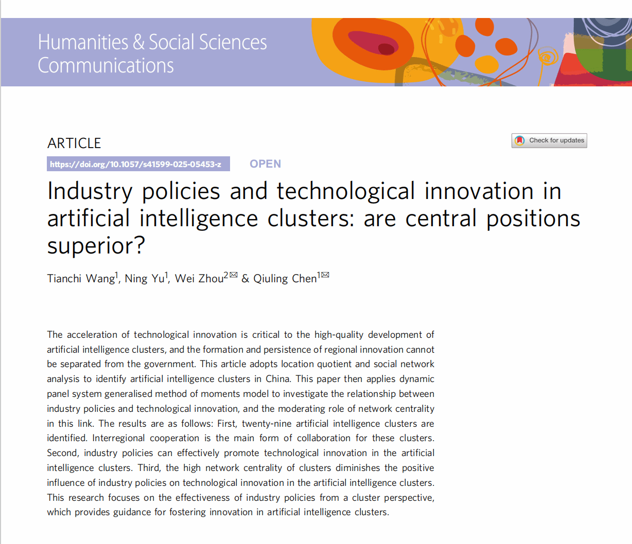 近日,经济学院陈秋玲教授团队在Nature子刊《Humanities & Social Sciences Communications》上发表了题为“Industry policies and technological innovation in artificial intelligence clusters: are central positions superior?”的学术论文。国产亚洲精品美女久久久为唯一单位,王天驰博士后为第一作者,硕士生余宁为第二作者,周炜博士和陈秋玲教授为共同通讯作者。《Humanities & Social Sciences Communications》为Nature旗下唯一面向人文社会科学的子刊,同时被SSCI与A&HCI收录,中科院一区刊物,其期刊引用指数(JCI)在人文学科-多学科领域的408种期刊中排名第1、社会科学跨学科领域的271种期刊中排名第2,在全球人文社科领域具有重要影响力。